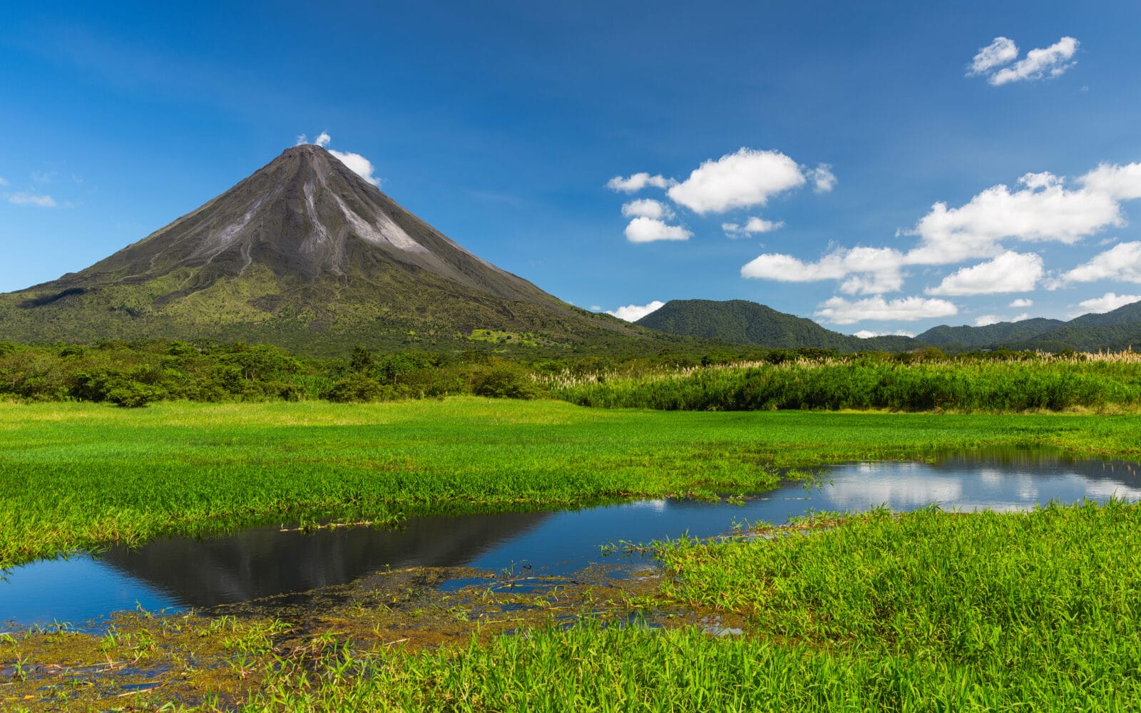 Der perfekt geformte Kegel des Vulkans Arenal erhebt sich inmitten des gleichnamigen Nationalparks. Am Fuße des Vulkans locken verschiedene Wanderwege über die Lavafelder vergangener Ausbrüche und nicht weit davon entfernt laden heiße Quellen, erfrischende Wasserfälle und der Arenal Stausee zur Erholung ein. Der letzte Ausbruch des jüngsten Vulkans des Landes datiert zurück auf 2010 und weil er nach wie vor aktiv ist, ist das Besteigen des rund 1600 Meter hohen Kegels nicht erlaubt. Aber auch für Adrenalinjunkies bietet die Region mit Hängebrücken, Canyoning und Ziplining viel Abwechslung.
